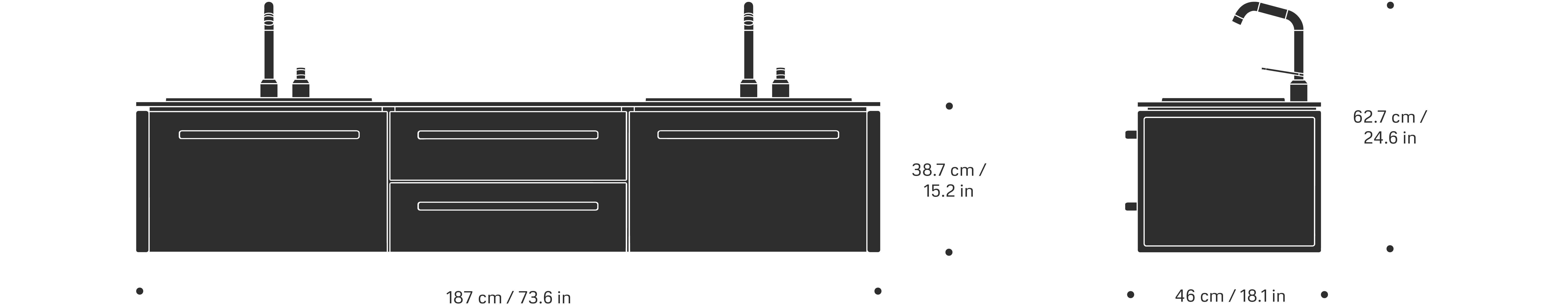 983 modul fra VIPP med et stilrent design med en elegant look, ekstra overflate og to håndfat. Den har fire skuffer med lange håndtak og to inkluderte kraner i rustfritt stål. Tidløst utseende perfekt for baderommet.