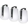 En 3-pakning med Balad lamper fra Fermob. Denne mindre versjonen gir enda mer fleksibilitet og funksjonalitet da den er liten og kan brukes utendørs. Størrelsen gjør lampen ideell for alle typer overflater; på bordet, i et hjørne, i vinduskarmen eller på en stubbe i hagen. Balad er moderne, fargerik og lett. Håndtaket er laget av lakkert aluminium, lampen er utstyrt med en oppladbar LED-teknologi. Balad S bruker samme teknologi som sine forgjengere og har en ny modus som etterligner et flimrende lys. Lampen tilbyr 3 forskjellige fargetemperaturer; nøytral hvit, kald hvit og et skinnende lysmodus. Etter 3,5 timers lading får du mellom 10-14 timers batterilevetid. En 2 meter lang USB-C ladingskabel følger med.