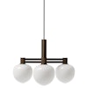 MEMOIR 120 III lysekrone fra LYFA med et moderne design med inspirasjon fra den klassiske lysekronen. Den har tre lett formede lampeskjermer i opalglass med en lineær struktur i metall med dekorative detaljer.