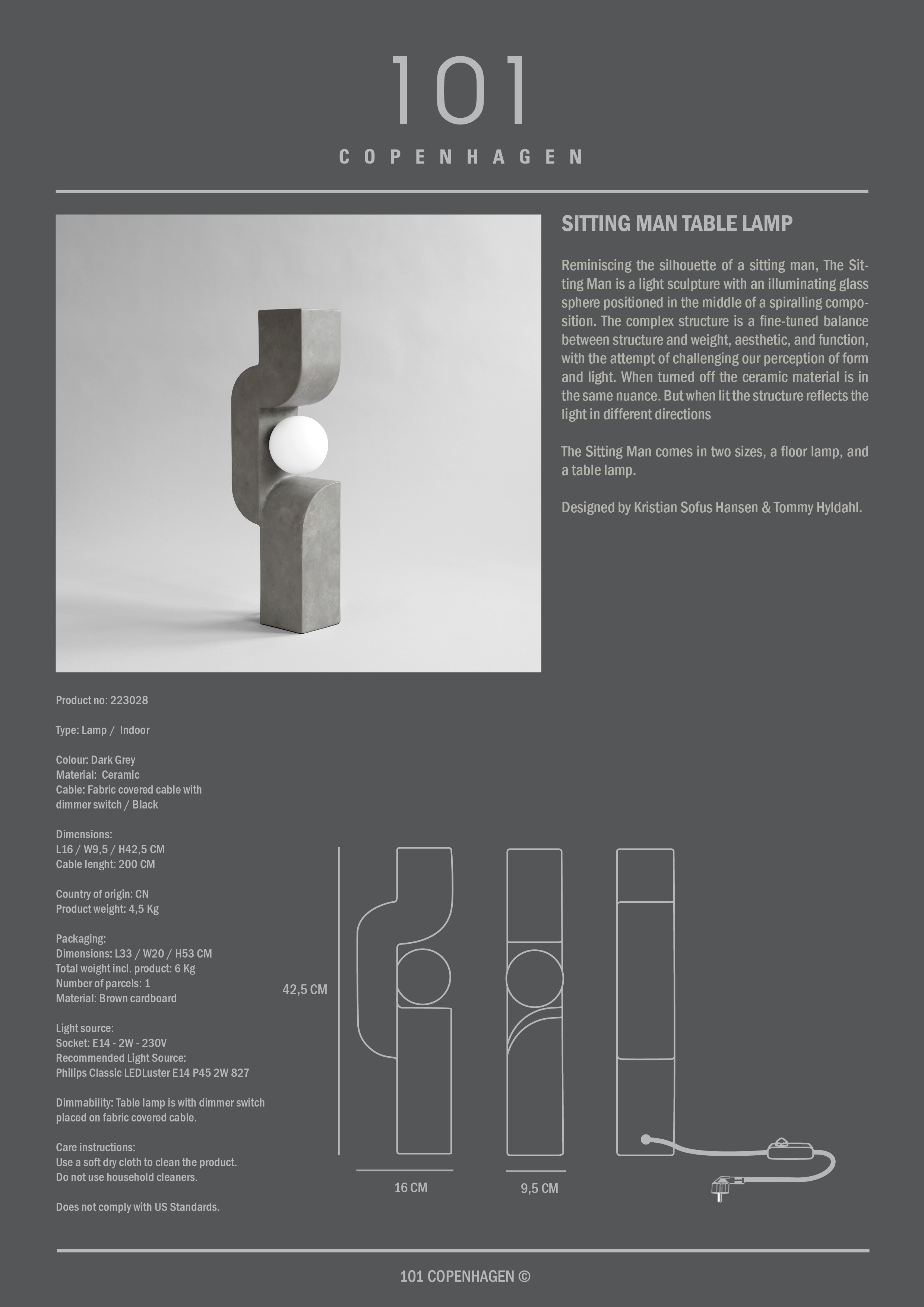 Sitting Man lampe fra 101 Copenhagen med et skulpturelt design med en spiralformet sammensetning og en rund glasskuppel i midten for å gi en jevn fordeling av lys. Den er laget av keramikk og har en dimmerknapp på ledningen for justering av lysstyrken. Kan også brukes som dekorasjon.