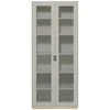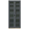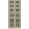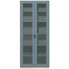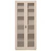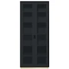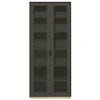 Skapet har glassdører med soft-close-funksjon, fem hyller for åpen oppbevaring og hviler på en stabil sokkel i massiv eik. Et perfekt møbel for utstilling av servise, glass eller interiørdetaljer.