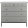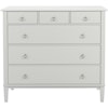 Rammen er laget av håndmalt massiv furu og MDF. Skuffefrontene har stilige ringhåndtak i matt krom.