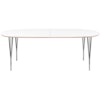 Symphony spisebord fra Haslev med et klassisk, tidløst, dansk design perfekt til ethvert hjem. Det har en slitesterk, hvit bordplate i laminat med smale, elegante ben i krom.