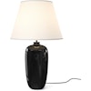 Torso bordlampe fra Audo Copenhagen med et tidløst, skulpturelt design. Den har en lampefot i keramikk med en myk form og en håndlaget, taktil skjerm i lin med en tretrinns dimmer i messing på toppen.