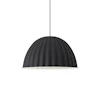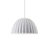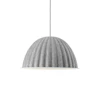Under The Bell pendel fra Muuto med et moderne design med en stor lampeskjerm for en god allmennbelysning. Den er laget av resirkulert materiale delvis med taktile, grafiske linjer for å skape en harmonisk atmosfære i rommet.